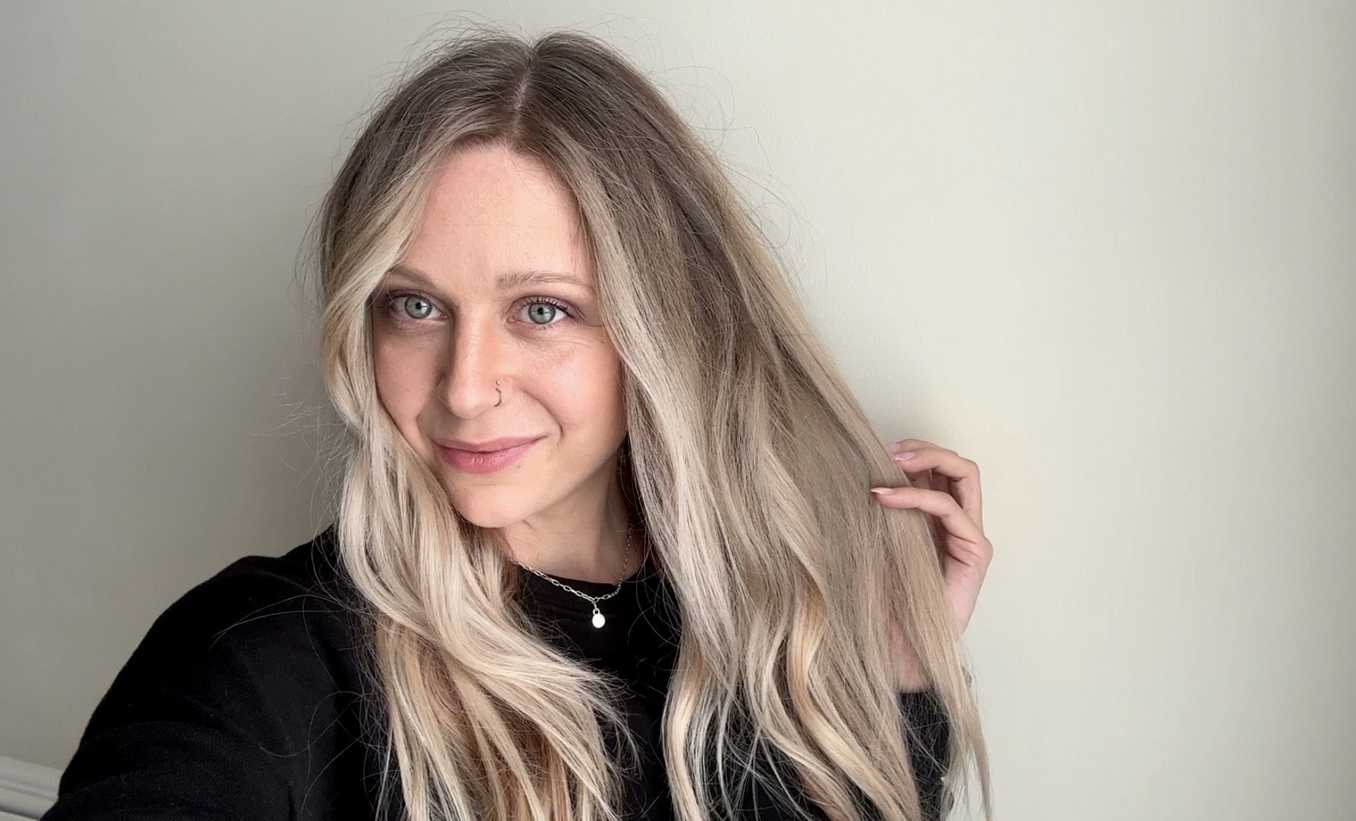 I’m currently in the process of growing out my all-over blonde hair. And three months ago, I did an airtouch highlighting technique to begin the blend into my darker natural hair color. But now that it’s grown out a bit, I want to brighten things back up around my face with a blended money piece so the growout continues to look intentional rather than unkempt.